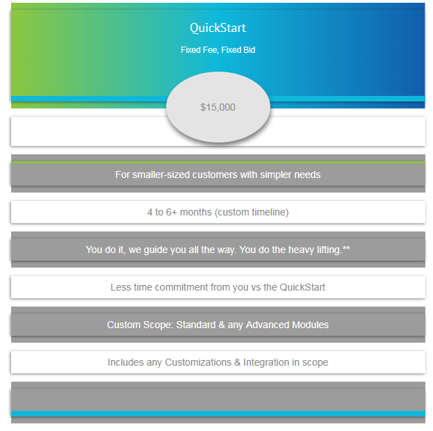 The Quick Start Implementation is a fixed fee/ fixed bid implementation option designed for small businesses with little to no customization needs. The Quick Start Self Implementation Package comes with a maximum of 160 hours of consultation, guidance and advisory time with a 90-day expiry. It has a fixed scope and only includes standard modules from NetSuite. The Quick Start Implementation has a fixed rate of US$15,000.